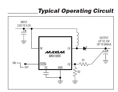 MAX1896EUT-T absolute maximum ratings: (1)LX to GND: -0.3V to +14V; (2)IN, SHDN, FB to GND: -0.3V to +6V; (3)SS to GND: -0.3V to (VIN + 0.3V); (4)RMS LX Pin Current: 0.6A; (5)Continuous Power Dissipation (TA = +70℃), 6-Pin SOT23 (derate 9.1mW/℃ above +70℃): 727mW; (6)Operating Temperature Range: -40℃ to +85℃; (7)Junction Temperature: +150℃; (8)Storage Temperature Range: -65℃ to +150℃; (9)Lead Temperature (soldering, 10s): +300℃.