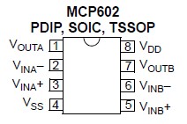 MCP602-I absolute maximum ratings: (1)VDD – VSS: 7.0V; (2)Current at Input Pins: ±2 mA; (3)Analog Inputs (VIN+, VIN–): VSS – 1.0V to VDD + 1.0V; (4)All Other Inputs and Outputs: VSS – 0.3V to VDD + 0.3V; (5)Difference Input Voltage: |VDD – VSS|; (6)Output Short Circuit Current: Continuous; (7)Current at Output and Supply Pins: ±30 mA; (8)Storage Temperature: –65℃ to +150℃; (9)Maximum Junction Temperature (TJ): +150℃; (10)ESD Protection On All Pins (HBM; MM): ≥ 3 kV; 200V.